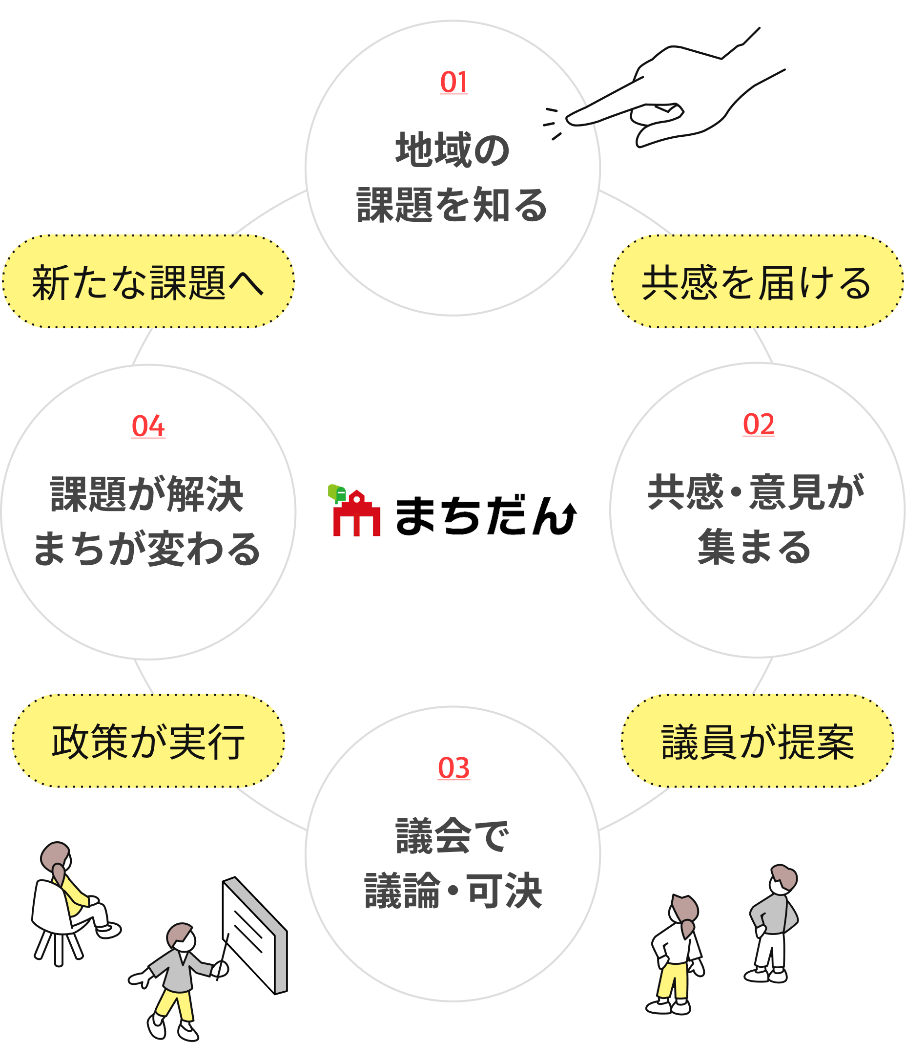 まちだんは、地域の課題を共有し、寄せられた共感や意見を議会に届けるための仕組みです。